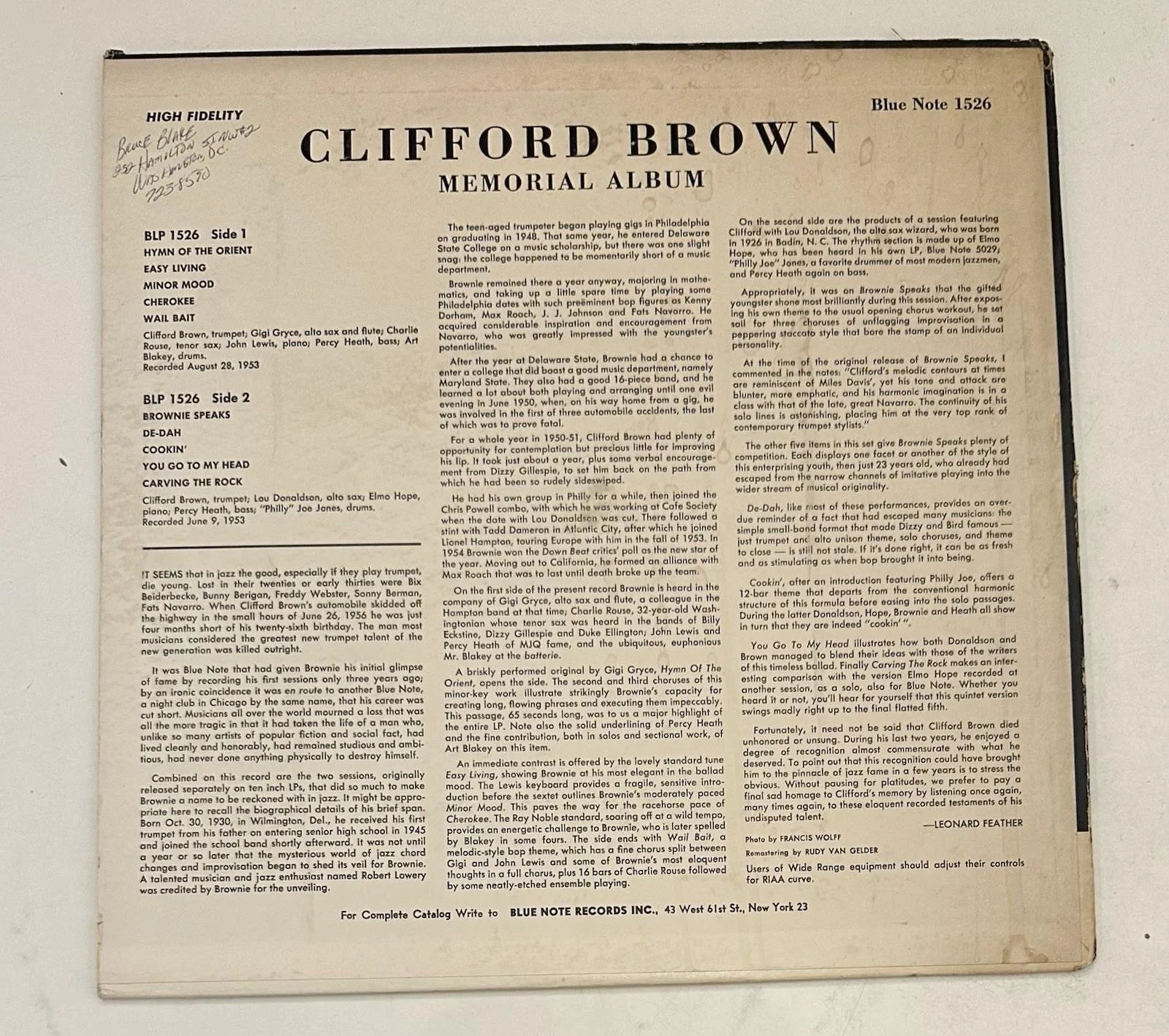 Clifford Brown ‎– Memorial Album Blue Note ‎– BLP 1526 LP, Mono US 1962